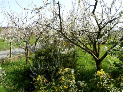 margherite e botton d’oro e gli alberi da frutto sono pieni di nuvole leggere e